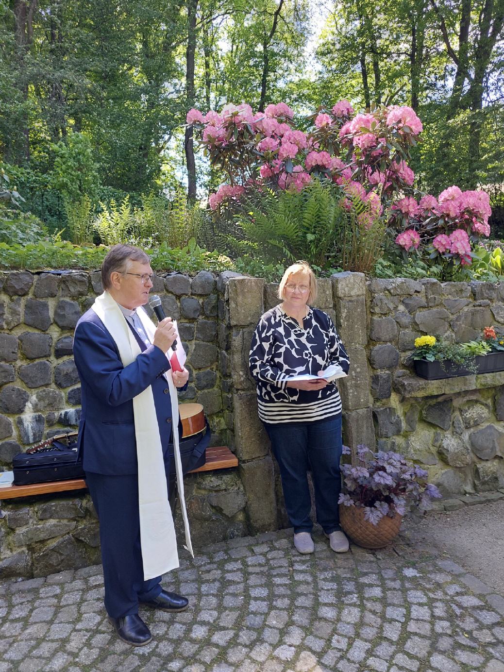 Pfarrer Franz Hilfenhaus, kath. und Pfarrer i.R. Helmut Brahn, evang. , hatten für die inhaltliche Ausrichtung Texte und Lieder zusammengestellt. Hervorragend, musikalisch begleitet von der Musikgruppe "himmelwärts" aus Kirchhasel. In seiner Ansprache ging Pfarrer Brahn insbesondere auf die Bedeutung der Mariengrotte ein. Die Grotte und deren Umgebung ist kein Selbstzweck, sondern ein Kleinod wo viele Menschen im Laufe eines Jahres immer wieder innere Kraft und Stärkung erfahren. Maria ist die Fürsprache für Menschen in Not und Krankheit, so Pfarrer Brahn. Deshalb lohnt sich die Grottenpflege für jeden einzelnen Besucher, der Trost und Ruhe finden möchte. Am Beispiel einer Frau, die seit 20 Jahren ein zweites Herz besitzt, zeichnete Pfarrer Brahn das große Vertrauen zur Gottesmutter um zu bitten und zu danken für diese außergewöhnliche Lebenschance. Dazu gehöre, so Brahn, sich auf Maria einzulassen und zu vertrauen, daß es durch Maria eine Fürsprache bei Jesus Christus gibt. Göttliche Beleitung und Maria gehen über alle Grenzen, ob katholisch oder evangelisch, hinaus. Vorsitzender Günter Pilz dankte abschließend allen Andachtsbesuchern und Mitwirkenden. Die ökumensichen Andachten sind ein Baustein für den gemeinsamen Weg beider Konfessionen in die Zukunft, unterstrich der Vorsitzende.