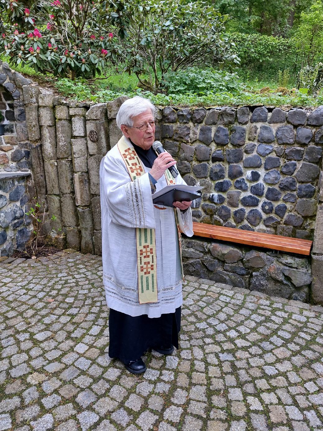 Hünhan. Die Eröffnungsandacht an der Mariengrotte Hünhan stand ganz im Zeichen des gemeinsamen Gebetes für den Frieden in der Welt. Pfarrer i. R. Gerhard Bug wies besonders auf die Andachten im Monat Mai hin. Dabei stellte er besonders die Muttergottes als Friedensfürstin in den Mittelpunkt. Die Entwicklungen in der Welt geben genug Anlass immer wieder für den Frieden zu beten, so Pfarrer Bug. Gemeinsam wurden bekannte Marienlieder gesungen der Abendgruß an Maria gebetet.