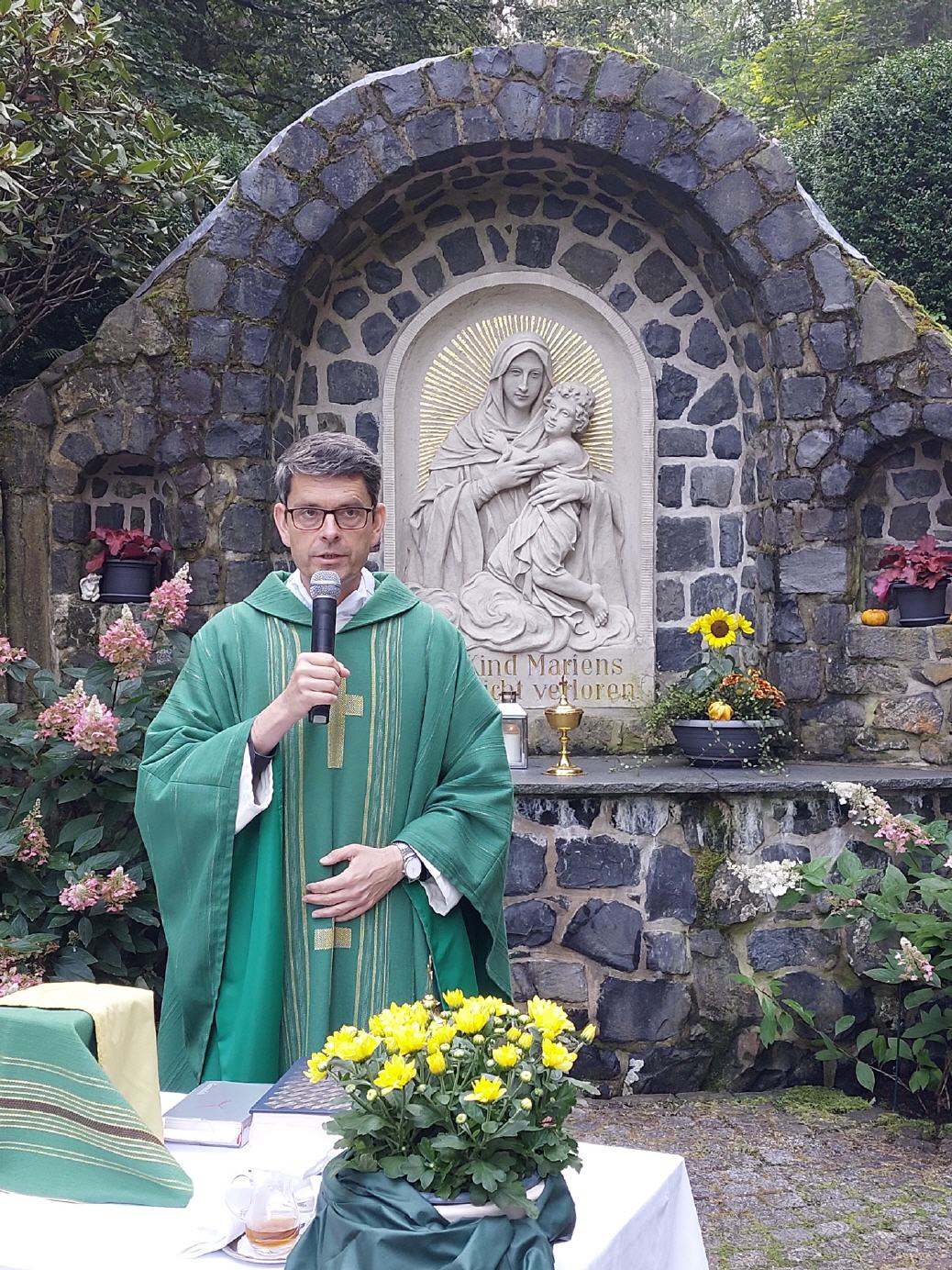 Hünhan. In einer eindrucksvollen Predigt anläßlich des Weltmissonstages an der Hünhaner Mariengrotte, rief Pater Heinz Stegmann OMI, die Andachtsbesucher auf, missionarisch für die Welt und in der eigenen Gemeinde tätig zu sein. Mission heißt gesandt zu sein, das heißt einen Auftrag erfüllen und etwas abliefern, so Steegmann. Es geht darum den Glauben, die innterste Überzeugung, dass Jesus Christus und der Glaube an ihn für mich und alle Menschen lebenswichtig ist. Gerade dieser Jesus Christus war ja der erste Missionar: zu uns gesandt von Gott, seinem Vater, um Gottes Freundschaft anzubieten.