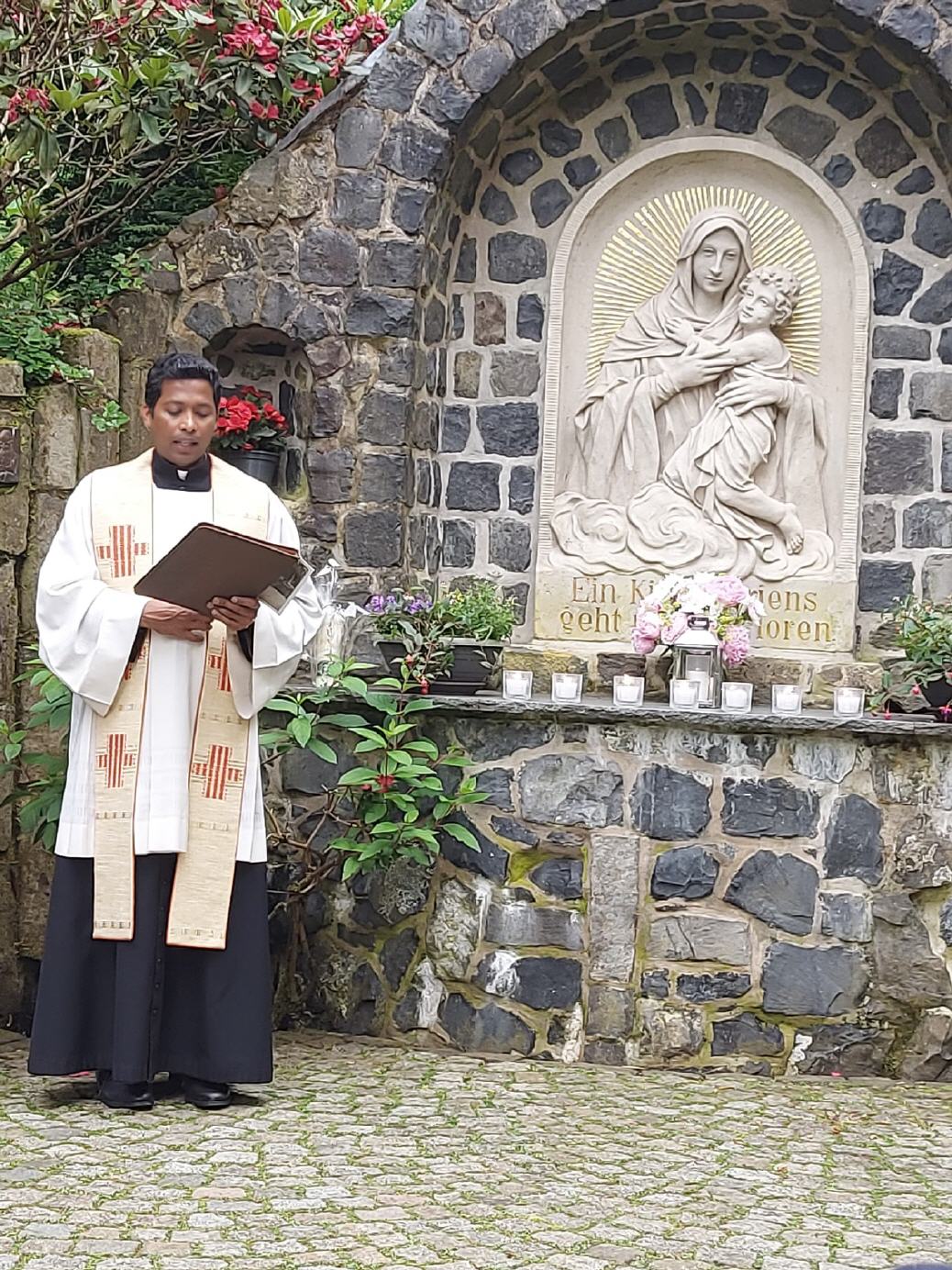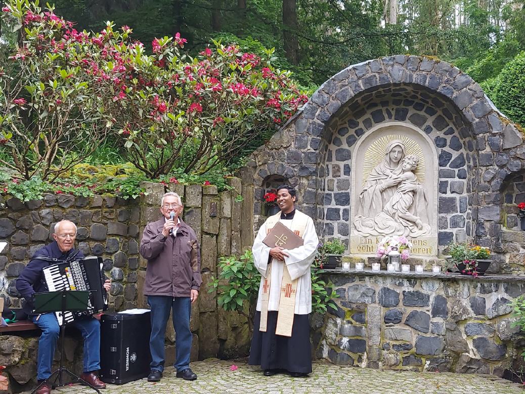 Hünhan. 30 Andachtsbesucher kamen bei beständiger Witterung zur Abschluss-Maiandacht zur Hünhaner Mariengrotte. Pater Binesh, Eiterfeld, stellte einfühlssame Texte in den Mittelpunkt. Ludwig Wenzel, Michelsrombach, begleitete auf dem Akkordeon die Marienlieder. In seiner Begrüßung betonte Pater Binesh den Schutz Mariens, der Königin des Friedens. Denn Unfrieden zeichnet das Gesicht der Welt. Menschen stehen einander unversöhnlich gegeüber, Hass und Gewalt zerreißen Familien und Gesellschaften. Krieg treibt Menschen in die Flucht, macht jedes normale Leben unmöglich, schlägt Wunden, die noch nach Generationen spürbar sein werden. Ausbeutung und Korruption verhindern, dass Menschen in Frieden und Sicherheit leben können. Überall auf der Welt finden sich Menschen mit dieser Realität nicht ab. Sie erheben ihre Stimme für Recht und Gerechtigkeit, sie suchen Wege des Friedens und folgen ihnen behutsam und beharrlich. Gegen alle Widerstände suchen sie mutig und phantasivoll nach Wegen des Friedens. Solche Menschen gibt es auch in Palästina und in der Ukraine oder Israel, so Pater Binesh. Mit unseren Gebeten schließen wir uns ihnen an und bitten Maria, unsere Königign des Friedens, um ihre Fürsprache, rief Pater Binesh den Andachtsbesuchern zu. Vorsitzender Günter Pilz bedankte sich bei Pater Binesh mit einer Dankeskerze der Mariengrotte sowie bei Ludwig Wenzel für die musikalische Begleitung. Die nächste Marienandacht ist am Sonntag, dem 16. Juni um 18.00 Uhr mit Pfarrer Peter Borta, Fulda.