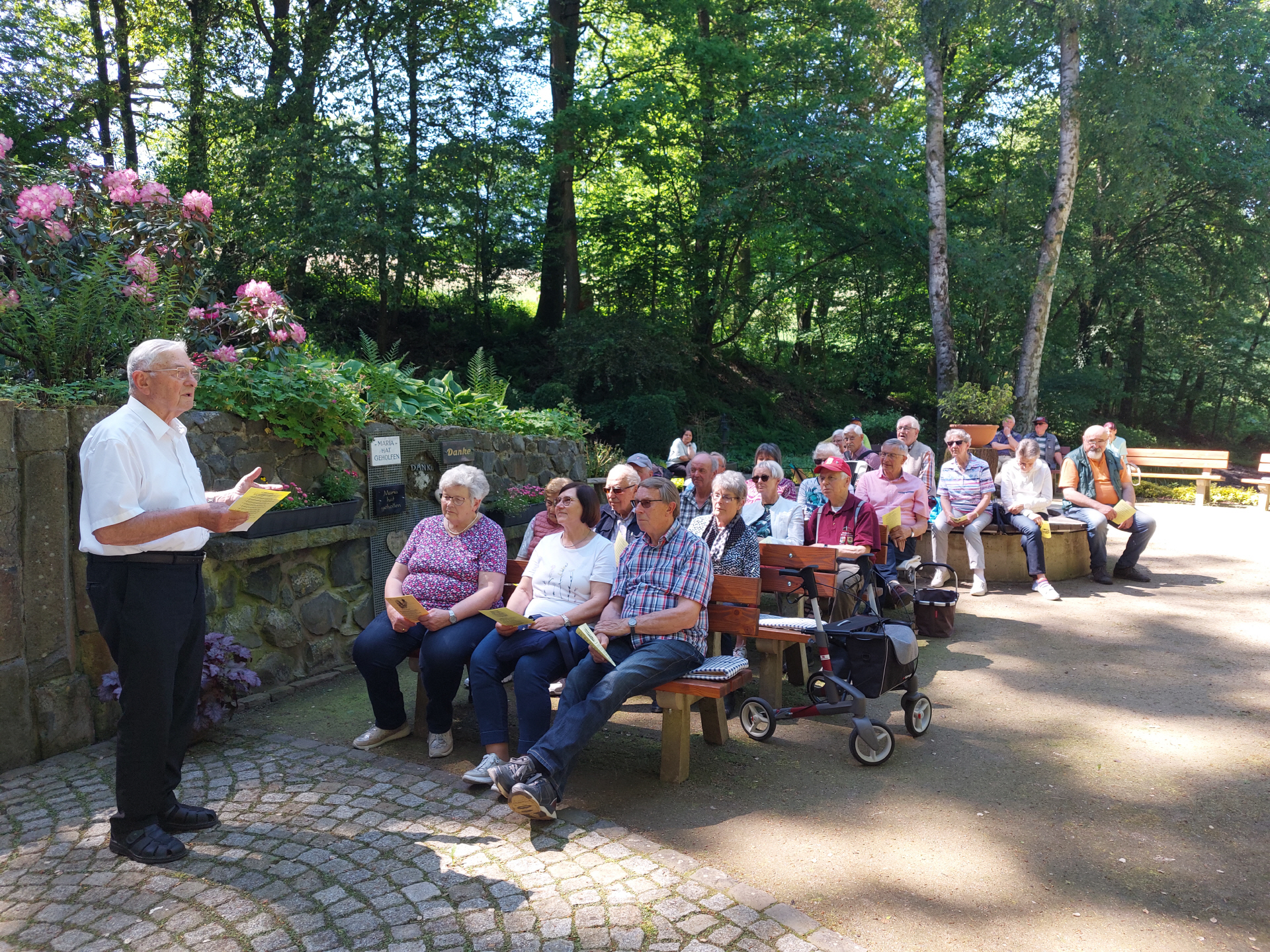 Fototext: Maiandacht 2020 mit Pfarrer Franz Hilfenhaus mit coronagemäßen Sitzordnung