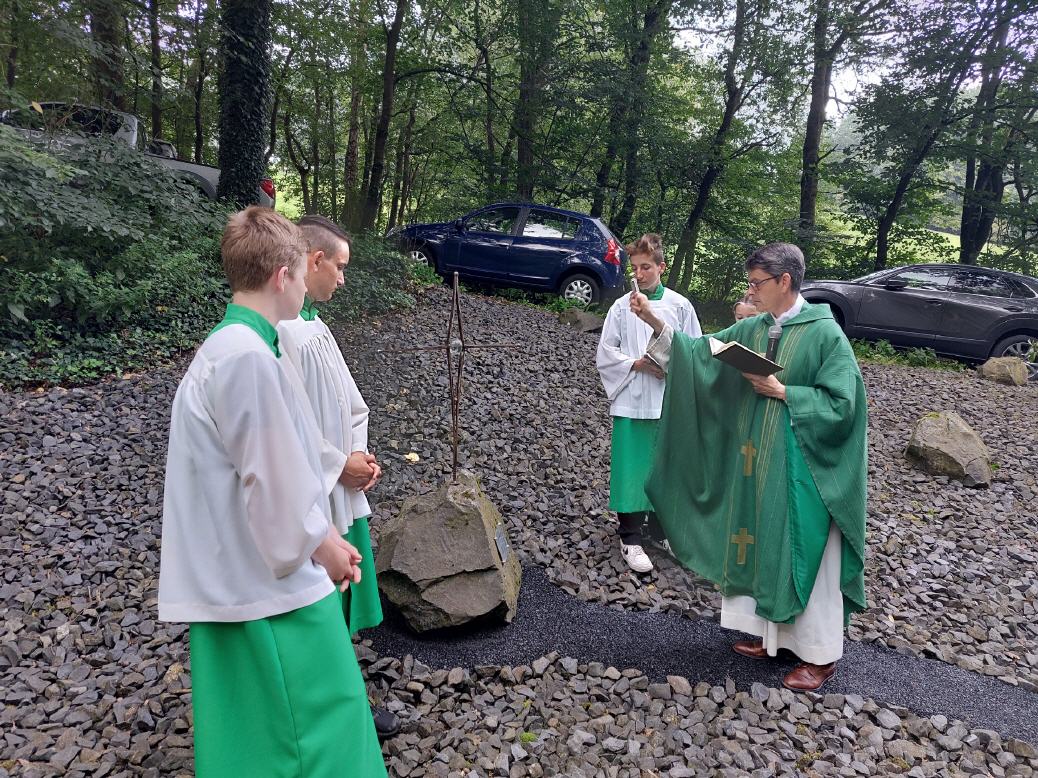 Hünhan. Anläßlich des Jahrestages zur Grotteneinweihung feierte der Förderkreis Mariengrotte Hünhan einen Gottesdienst mir Dechant, Pfr. Markus Blümel und der Blaskapelle Motzlar. Der sehr gut besuchte Gottesdienst erfreute die Herzen der Zuhörer durch die lebendigen, aber auch nachdenklichen Worte von Dechant Blümel. Am Schluss des Gottesdienstes weihte Dechant Blümel das von Rainer Spiegel geschaffene Friedenskreuz. Vorsitzender Günter Pilz dankte allen Mitwirkenden und Besuchern, besonders aber Dechant Blümel für seine stärkenden Worte.